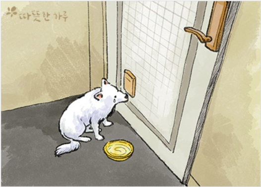 한 다세대 주택 앞에서 하얀 강아지 한 마리가 굳게 닫힌 문을 열어달라고 보채고 있었습니다. 하지만 문은 열리지 않았고 강아지는 며칠이 지나도록 그 집 앞에서 문이 열리기를 기다리며 누군